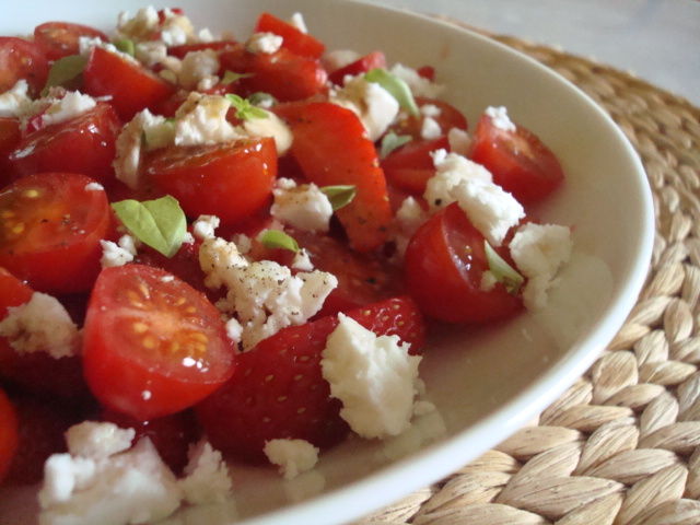 tomate cereja + morangos + queijo de cabra + manjericão + azeite extra.